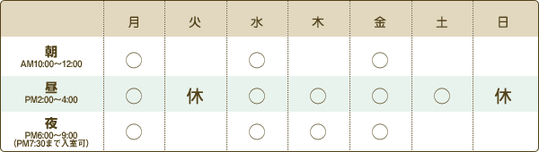 - 夜の部(6:00~9:00)は6時から7時30分までお入りいただけます。入室時間より、1時間30分~2時間のレッスンが各進行にあわせて受けられます。